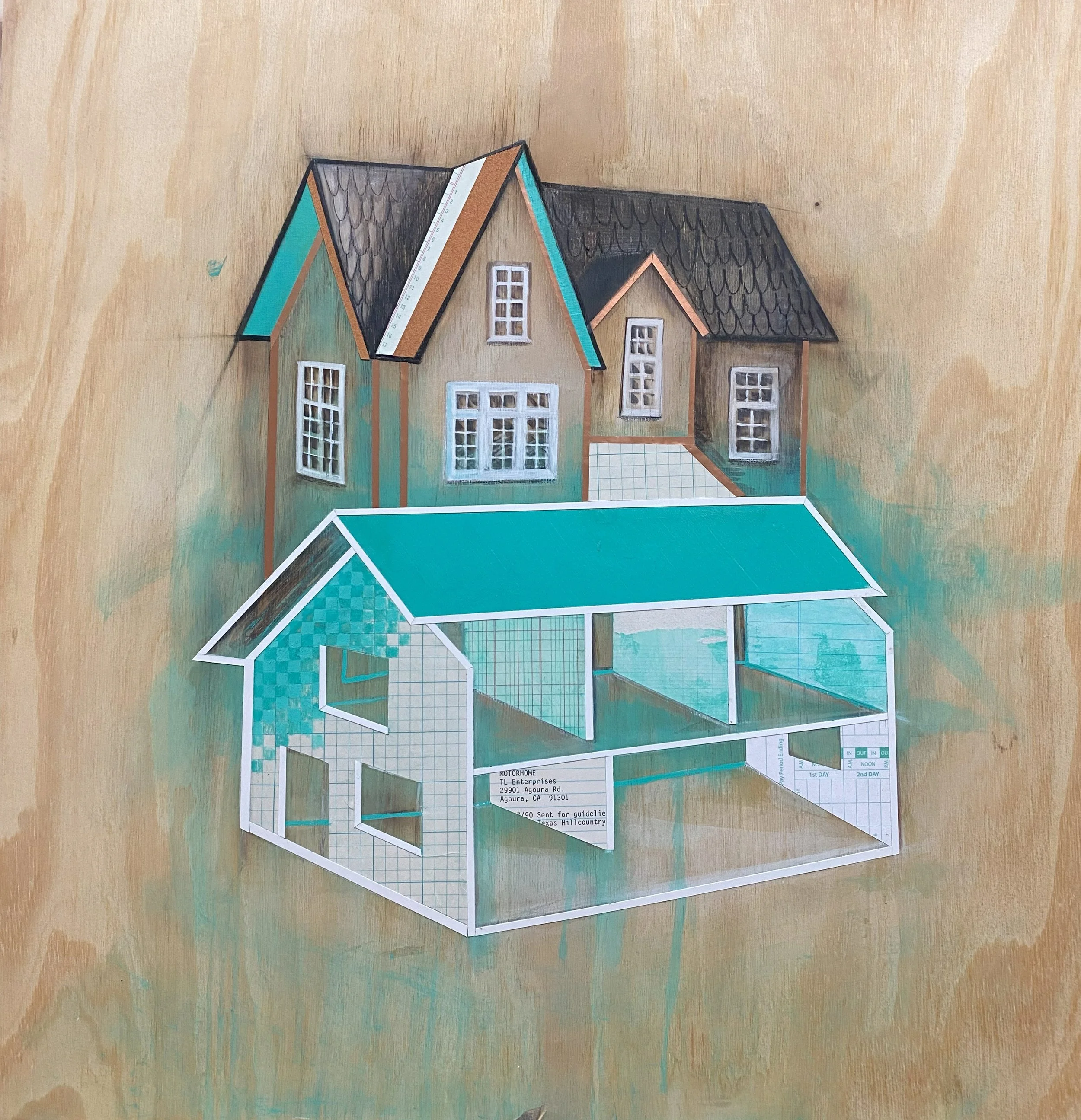 C. B. Hon is an artist whose work explores overconsumption, domestic expectation, and DIY culture through collage, assemblage, and drawing. Raised in a constantly evolving fixer-upper filled with thrifted objects, Hon draws from a personal archive of domestic materials and symbols to examine how material excess becomes emotional inheritance.